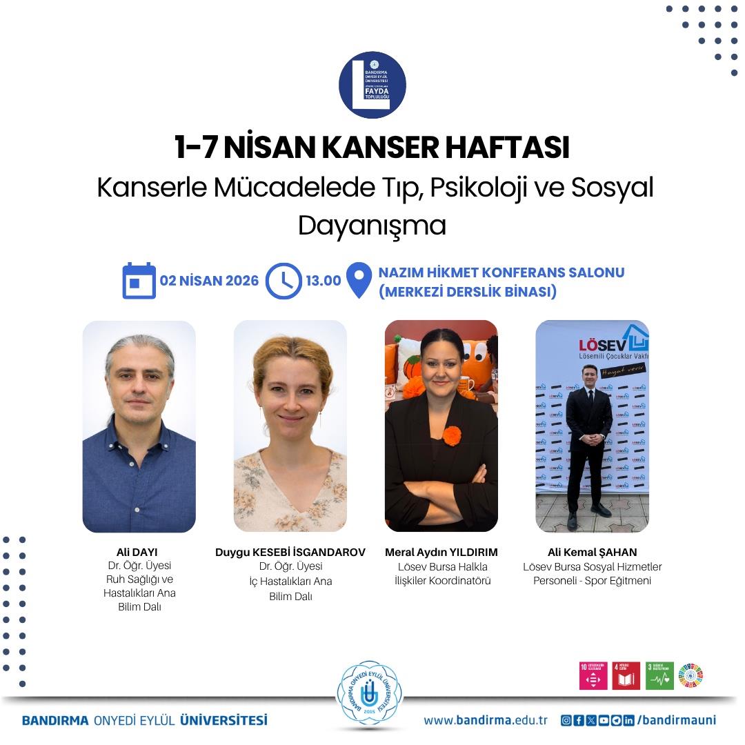 Bandırma Onyedi Eylül University is pleased to invite you to our event titled "Medicine, Psychology, and Social Solidarity in the Fight Against Cancer," which will be held as part of Cancer Awareness Week (April 1-7).