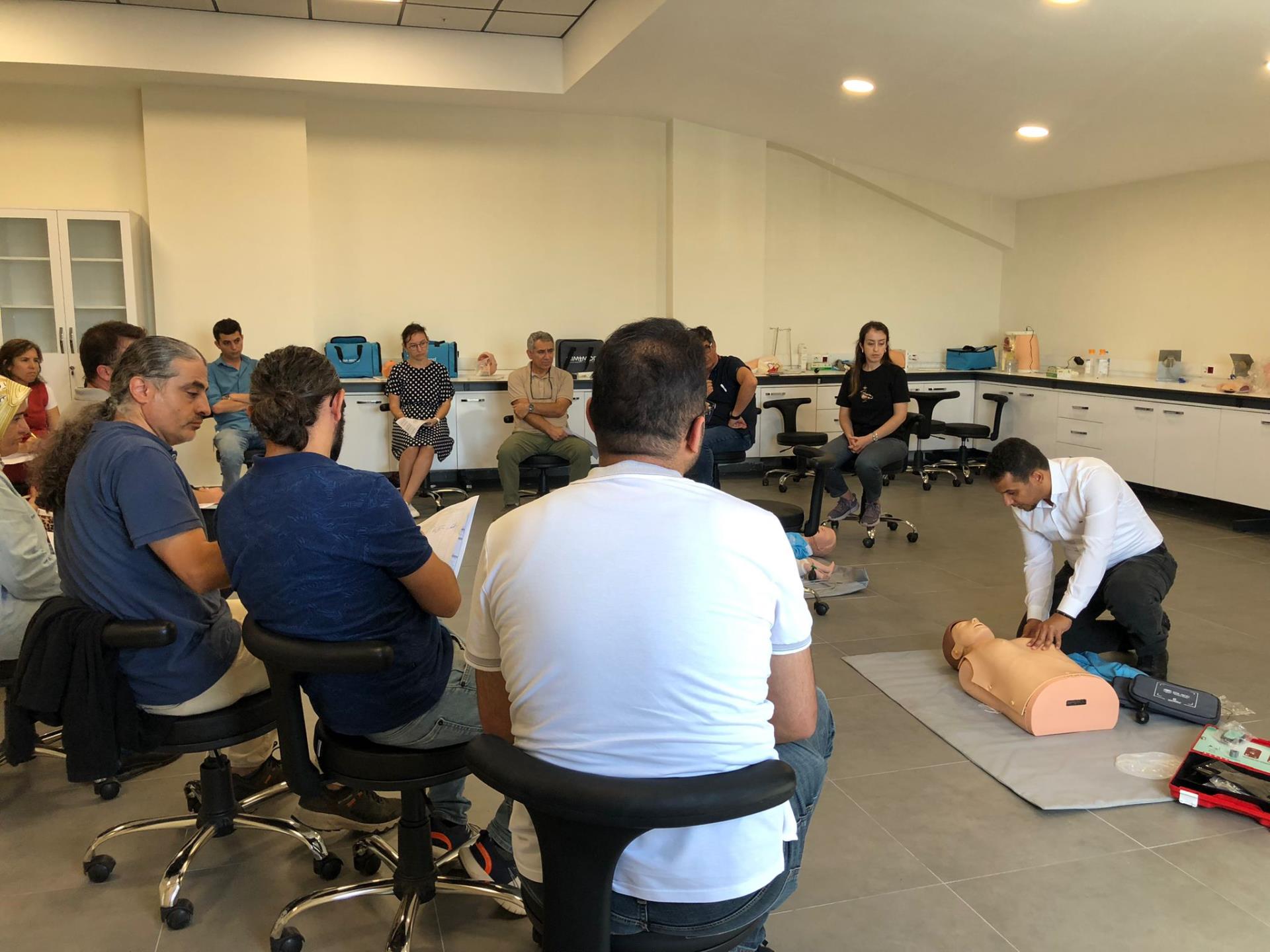 Prof. Dr. Oktay ERAY, Dr. Öğr. Üyesi Reşad BEYOĞLU ve Dr. Öğr. Üyesi Gülşen ÖZTÜRK ÖRMECİ tarafından verilen eğitimde, kardiyak arrest algoritmaları, temel ve ileri hava yolu yönetimi, defibrilasyon ve ilaç uygulamaları gibi güncel kılavuzlara dayalı konular ele alınmıştır. Senaryo temelli uygulamalarla katılımcıların acil durumlarda etkin müdahale becerilerinin geliştirilmesi amaçlanmıştır.